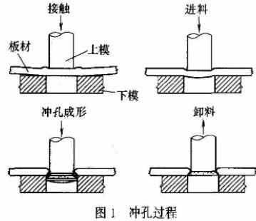 - (1)數(shù)控沖床沖壓過程模具的詳細(xì)沖壓過程見圖1,沖壓時(shí)會(huì)在材料的斷面形成塌陷帶、光亮帶、撕裂帶和毛刺四部分,見圖2.其各部分的尺寸受材料厚度和模具間隙等因素影響會(huì)有所不同。