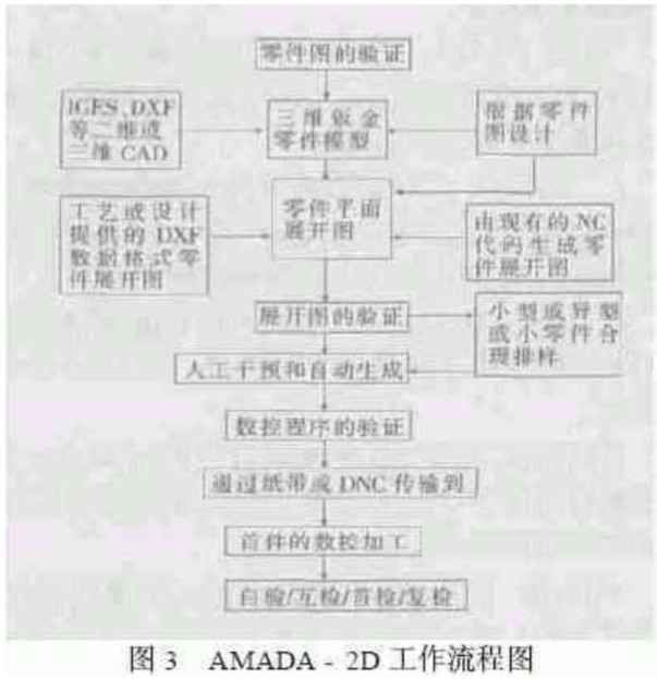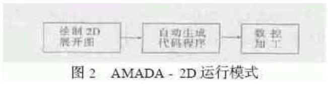 由于處于一種人工繪制展開圖、計算各項數據、手工輸入狀態,因而編程效率非常低;另外,文件管理系統有限,不便丁貯存、管理、查詢程序文件。特別是我所軍民品生產任務工作量大,品種繁多,如果不建立產品的程序文件數據庫,將會出現人量不必要的重復勞動。1.3 這種局面的存在嚴重地制約了我所軍民品牛產任務的需要,為進一步提高加工效率,縮短加工周期、提高加工精度,使先進的設備能更好的服務'T科研牛產,經過對市場上的數控沖床編程軟件允分地調研、分析、論證,我所于2002年將AMADA - 1E編程系統升級為AMADA - 2D編程系統。其運行模式如圖2所示。