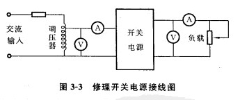 數控系統中對各電路板供電的系統電源大多數采用開關型穩壓電源。這類電源種類繁多,故障率也較高,但大部分都是分立元件,用萬用表、示波器即可進行檢查。維修開關電源時,最好在電源輸入指接一只1 : 1的隔離變壓器,以防觸電。另外,為了防止在修理過程中可能導致好的元件損壞,或引發新的故障,最好按圖3-3所示的接線方法,使輸入電壓從OV開始逐漸增大。在輸入和輸出回路中都有電流、電壓檢測,一旦發現有過壓或過流現象,即可關掉總電源,不致造成損失。