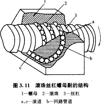 滾珠絲杠螺母副的結構是在絲杠和螺母上都加工有圓弧形的螺旋槽,如圖3. 11所示,這兩個圓弧形的螺旋槽對合起來就形成了螺旋滾道。在液道內裝有滾珠,當絲杠和螺母相對運動時,滾珠沿螺母上的螺旋槽向前滾動,因此絲杠與螺母之間基本上為滾動摩擦。為了防止滾珠從螺母中滾出來,在螺母的螺旋槽兩端設有回程引導裝置,滾珠在絲杠上滾過數圃以后通過回程引導裝置,又逐個地滾回到絲杠和螺母之間,構成一個閉合的回路。