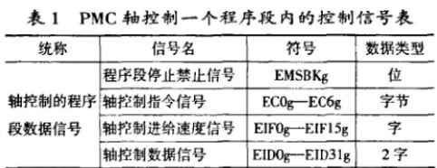 從FANUC系統定義我們知道,軸控制指令信號、軸控制進給速度信號、軸控制數據信號和程序段停止禁止信號一起決定一個完整的操作。這些信號總稱為軸控制程序段數據信號,相當于CNC控制的自動操作期間執行一個程序段。其控制信號見表1。