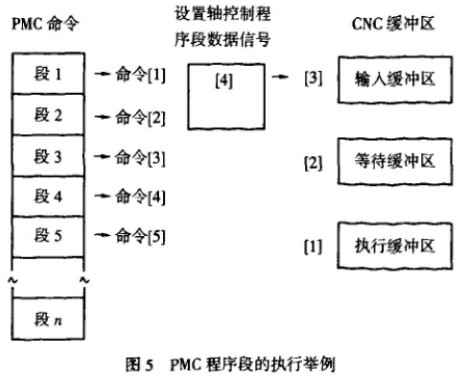 當命令(1)的執行完成時:命令(2)從等待緩沖區傳輸到執行緩沖區;命令f3]從輸入緩沖區傳輸到等待緩沖區;命令(4)傳輸到輸入緩沖區作為指令程序段;輸入緩沖區接收的命令f4]后.PMC把命令(5)發送到CNC(軸控制程序段數據信號被設定)。