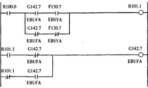 在3.3中已經確定了Z軸作為PMC軸需要指令程序段的控制程序段數據,因此,要完成程序段的執行,我們按照信號EBUFA和EBSYA邏輯狀態的要求編人梯形圖(圖7)。