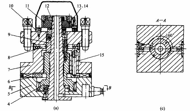 圖3. 26為臥式八軸轉塔頭自動換刀裝置。轉塔頭上徑向分布著人根結構完全相同的主軸1,主軸的回轉運動由齒輪15輸入。當數控裝置發出換刀指令時,通過液壓撥叉(圖中未示出)將移動齒輪6與齒輪15脫離暗合,同時在中心液壓缸13的上腔通壓力油。由于活塞桿和活塞口固定在底座上,因此中心液壓缸13帶有兩個推力軸承9和11將支承的轉塔刀架體10抬起,鼠齒盤7和8脫離啃合。然后壓力油進入轉位液壓缸,推動活塞齒條,再經過中間齒輪使大齒輪5與轉塔刀架體10-起回轉45°,并將下一道工序的主軸轉到工作位置。轉位結束后,壓力油進入中心液壓缸13的下腔使轉塔頭下降,鼠肯盤7和8重新啃合,實現了精確的定位。在壓力油的作用下,轉塔頭被壓緊,轉位液壓缸退回原位。最后通過液壓撥叉撥動移動齒輪6.使它與新換上的主軸齒輪15啃合。