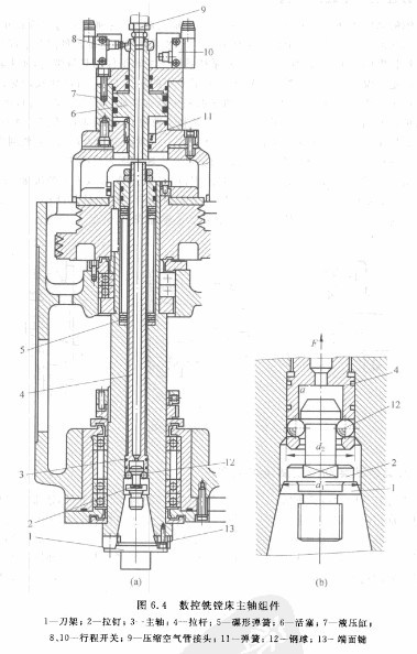 對于帶有刀具庫的數控沖床,主軸組件除具有較高的精度和剛度外,還帶有刀具自動裝卸裝置和主軸孔內的切屑消除裝置,如圖6.4所示。主軸前端有7:24的錐孔,用于裝夾錐輛刀具;端面鍵13既做刀具定位用,又可通過它傳遞轉矩;為了實現刀具的自動裝卸,主軸內設有刀具自動夾緊裝置。從圖中可以看出,該數控沖床是由拉緊機構拉緊錐柄刀架尾端的軸頸來實現刀架的定位及夾緊。夾緊刀架時,液壓缸上腔接通回油,彈簧11椎動活塞6上移,處于圖示位置;拉桿4在碟形彈簧5的作用下向上移動。由于此時裝在拉桿前端徑向孔中的四個銅球12進入主軸孔中直徑較小的d2處(見圖6.4(b)被迫徑向收攏而卡進拉釘2的環形凹槽內,因而刀桿被拉桿拉緊,依靠摩擦力緊團在主軸上。換刀前需將刀架松開時,油液進入液壓缸上腔,活塞6椎動拉桿4向下移動,碟形彈簧被壓縮當鋼球12隨拉桿一起下移進入主軸孔中直徑較大的d1處時,它就不再能約束拉釘的頭部,緊接著拉桿前端內孔的臺肩端面碰到拉釘,將刀架頂松。此時行程開關10發出信號,換刀機械手隨即將刀架取下。與此同時,壓縮空氣由管接頭9經活塞和拉桿的中心通孔吹入主軸裝刀孔內,把切屑或臟物清除干凈,以保證刀具的裝夾精度。機械手將新刀裝上主軸后,液壓缸7接通回油,碟形彈簧又拉緊刀架。刀架拉緊后,行程開關8發出信號。