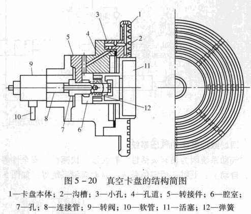 在卡盤的前面裝有吸盤,盤內形成真空,而薄的被加工件就都大氣壓力被壓在吸盤上以達到夾緊的目的。一般在卡盤本體1上開有數條圓形的溝糟2,這些溝槽就是前面提到的吸盤,這些吸盤是通過轉接件5的孔道4與小孔3相通,然后與卡盤體內氣缸腔室6相連接。另外腔室6通過氣缸活塞桿后部的孔7通向連接管8,然后與裝在主軸后面的轉閥9相通。通過軟管10同真空泵系統相連接,按上述的氣路造成卡盤本體溝槽內的真空,以吸著工件。反之,要取下被加工的工件時,向溝槽內通以空氣。氣缸腔室6內有時真空有時充氣,所以活塞11有時縮進有時伸出。此活塞前端的凹窩在卡緊時起到吸著的作用。即工件被安裝之前缸內腔室與大氣相通,所以在彈簧12的作用下活塞伸出卡盤的外面。當工件被卡緊時缸內造成真空則活塞頭縮進,一般真空卡盤的服引力與吸盤的有效面積和吸盤內的真空度成正比。在自動控制中,有時要求卡緊速度要快,而卡緊速度則由真空卡盤的排氣量來決定。