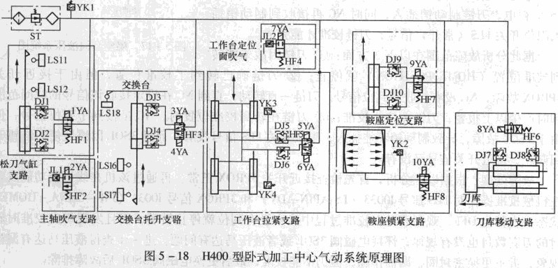 如圖5 -18所示,由于H400加王中心要進(jìn)行雙工作臺(tái)的交換,為了節(jié)約變換時(shí)間,保證交換的可靠,工作臺(tái)與鞍座之間必須具有能夠快速、可靠的定位、夾緊及迅速脫離的功能。可交換的工作臺(tái)固定于鞍座上,由4個(gè)帶定位錐的氣缸夾緊,為了達(dá)到拉力大于12000N的可靠工作要求,以及受位置結(jié)柏的限制,該氣缸采用了彈簧增力結(jié)構(gòu),在氣缸內(nèi)徑僅為ct>63mm的情況下就達(dá)到了設(shè)計(jì)拉力要求。例如,數(shù)控沖床氣動(dòng)系統(tǒng)原理圖5二18所示,該支路采用兩位雙電控電磁閥HF5進(jìn)行控制,當(dāng)雙工作臺(tái)交換將要進(jìn)行或已經(jīng)進(jìn)行完畢時(shí),數(shù)控系統(tǒng)通過(guò)PMC控制電磁閥HF5,使線(xiàn)圈5YA或6YA得電,分別控制氣缸活塞的上升或下降,通過(guò)鋼珠拉 套機(jī)構(gòu)放松或拉緊工作臺(tái)上的拉釘,完成鞍座與工作臺(tái)之間的放松或夾緊。為了避免活塞運(yùn)動(dòng)時(shí)的沖擊,在該支路采用具有得電動(dòng)作、失電不動(dòng)作、雙線(xiàn)圈同時(shí)得電不動(dòng)作特點(diǎn)的兩位雙電控電磁|詡HF5進(jìn)行控制,可避免在動(dòng)作進(jìn)行過(guò)程中突然斷電造成的機(jī)械部件沖擊損傷。采用單向節(jié)流閥DJ5、DJ6來(lái)調(diào)節(jié)夾緊的速度,避免較大的沖擊載荷。該位置由于受結(jié)構(gòu)限制,用感應(yīng)開(kāi)關(guān)檢測(cè)放松與拉緊信號(hào)較為困難,故采用可調(diào)工作點(diǎn)的壓力繼電器YK3、YK4檢測(cè)壓力信號(hào),并以此信號(hào)作為氣缸的到位信號(hào)。