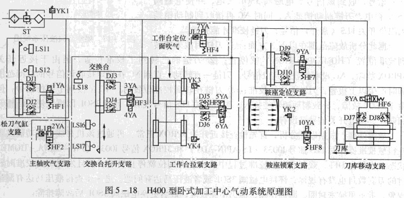 如圖5 -18所示, H400型數控沖床工作臺具有回轉分度功能。與工作臺連接為一體的鞍座采用蝸輪蝸桿機構使之可以回轉,鞍座與床鞍之間具有了相對回轉運動,并分別采用插銷和可以變形的薄壁氣缸實現床鞍和鞍座之間的定位與鎖緊。當數控系統發出鞍座回轉指令并做好相應的準備后,兩位單電控電磁閥HF7得電,定位插銷缸活塞向下帶動定位銷從定位孔中拔出,到達下運動極限位置后,由感應開關檢測到位信號,通知數控系統可以進行鞍座與床鞍的放松,此時兩位正在電控電磁闊盯8得電動作,鎖緊薄壁缸中高壓氣體放出,鎖緊活塞彈性變形囚復,使鞍座與床鞍分離。該位置由于受結構限制,檢測放松與鎖緊信號較困難,故采用可調工作點的壓力繼電器YK2檢測壓力信號,并以此信號作為位置檢測信號。該信號送人數控系統,控制鞍座進行回轉動作,鞍座在電動機、同步帶、蝸桿-蝸輪機構的帶動下進行回轉運動。當達到預定位置時,由感應開關發出到位信號,停止轉動,完成回轉運動的初次定位。電磁閥HF7斷電,插銷缸下腔通人高壓氣,活塞帶動插銷向上運動,插入定位孔,進行回轉運動的精確定位。定位銷到位后,感應開關發信通知鎖緊缸鎖緊,電磁閥舊3失電,鎖緊缸充入高壓氣體,鎖緊活塞變形,YK2檢測到壓力達到預定值后,即是鞍座與鞍床夾緊完成。至此,整個鞍座回轉動作完成。另外,在該定位支路中, DJ9、DJIO是為避免插銷沖擊損壞而設置的調節上升、下降速度的單向節流閥。