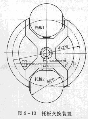 當需要更換托板時,控制系統發出指令,使分度工作臺返回零位,此時液壓閥16接通,壓力油進入油腔9,使得液壓缸11.向上移動,托板則脫開定位銷J2。當托板被頂起后,液壓缸帶動齒條(見圖6 -10中虛錢部分)向左移動,從而帶動與其相啃合的齒輪旋轉并使整個托板裝置旋轉,使托板沿著滑動軌道旋轉180。,從而達到托板交換的目的。當新的托板到達分度工作臺上面時,空氣閥接通,壓縮空氣經管路從托板定位銷12中間吹出,消除托板定位銷孔中的雜物。同時,電磁液壓閥2接通,壓力油進入液壓腔8,迫使油缸川向下移動,并帶動托板夾緊在4個定位銷12中,完成整個托板的交換過程。