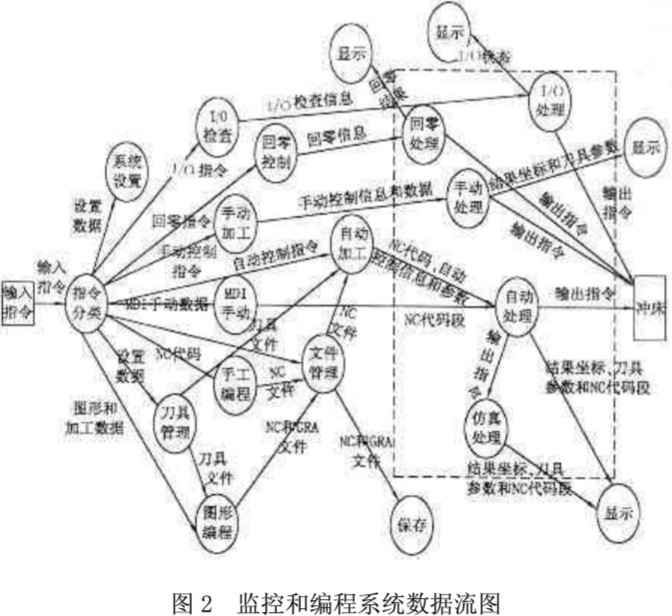 數(shù)控沖床監(jiān)控和編程系統(tǒng)的數(shù)據(jù)流圖如圖2所示,其中虛線方框內(nèi)的手動處理、I/O處理、自動處理、仿真處理和回零處理等過程由控制機完成,其數(shù)據(jù)詞典分類如下: