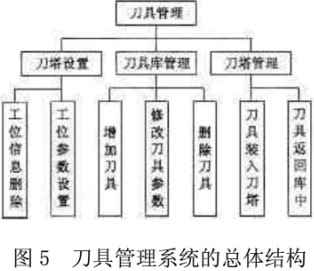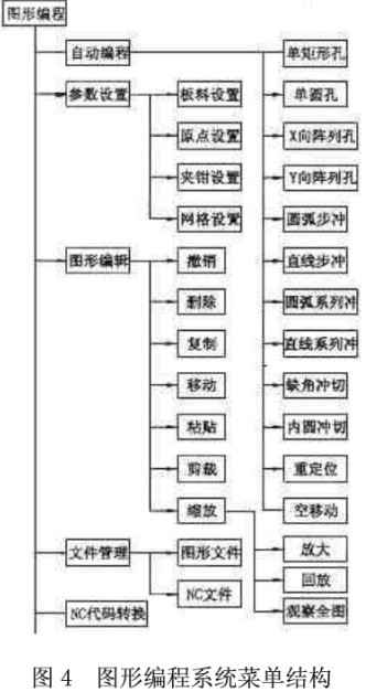 數(shù)控沖床監(jiān)控和編程系統(tǒng)的總體結(jié)構(gòu)分為三部分:監(jiān)控子系統(tǒng)、編程子系統(tǒng)和刀具管理子系統(tǒng),其中編程子系統(tǒng)包括圖形編程和手工編程兩部分。手工編程只需調(diào)用Windows中已有的編輯器如Notepad即可實現(xiàn)。監(jiān)控和編程系統(tǒng)的結(jié)構(gòu)如圖3所示。監(jiān)控、編程和刀具管理三個子系統(tǒng)分別完成系統(tǒng)的一部分功能,相對獨立,不同子系統(tǒng)在數(shù)據(jù)結(jié)構(gòu)、控制算法和控制模式等方面具有不同的性質(zhì)和特點,同時,整個系統(tǒng)又是各子系統(tǒng)的有機組合,有著密切的聯(lián)系,因而各子系統(tǒng)之間必須存在著信息交換和協(xié)調(diào)問題。在進行系統(tǒng)的研究和設(shè)計時,應(yīng)盡量減少各部分之間的耦合,以利于各子系統(tǒng)功能的實現(xiàn):同時應(yīng)保持各系統(tǒng)之間清晰的信息接口,以增強系統(tǒng)的重構(gòu)和擴展能力。圖形編程系統(tǒng)菜單結(jié)構(gòu)見圖4,刀具管理系統(tǒng)的總體結(jié)構(gòu)見圖5。