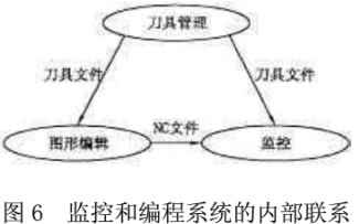 隨著當今制造業(yè)靈活快速制造的發(fā)展,數(shù)控沖床也向著具有多種復(fù)合功能、更加穩(wěn)定可靠、更大柔性、適應(yīng)多品種小量的方向發(fā)展,有建立沖壓過程的柔性制造系統(tǒng)的發(fā)展趨勢。本文在進行數(shù)控系統(tǒng)監(jiān)控和編程系統(tǒng)的研究和開發(fā)時,力求增強系統(tǒng)柔性,將監(jiān)控和編程系統(tǒng)作為一個內(nèi)部彼此聯(lián)系、相互作用、相互制約的集成性整體。本系統(tǒng)各部分的功能相對獨立,刀具管理系統(tǒng)進行刀具庫和刀塔的管理和控制,根據(jù)刀具和刀塔參數(shù)生成刀具文件;圖形編程系統(tǒng)根據(jù)輸入的圖形和加工信息生成NC程序文件;監(jiān)控系統(tǒng)則對沖床加工進行監(jiān)控和控制。另一方面,整個系統(tǒng)又是一個相互聯(lián)系、相互制約的集成性整體,圖形編程時,要以刀具管理系統(tǒng)所生成的刀具文件為依據(jù)進行人機交互刀具選擇;而在對沖床進行自動加工控制時,需要輸入相應(yīng)的NC程序,而且在加工前要進行刀具檢查,檢查該NC程序所需刀具和刀塔上安裝的刀具是否一致。圖6所示為本系統(tǒng)各部分之間的聯(lián)系。