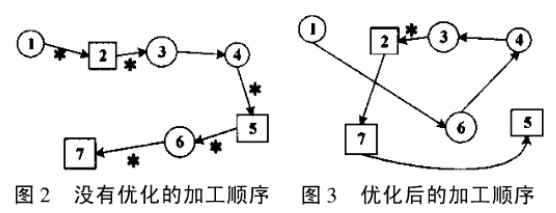 ①加工時(shí)間最優(yōu)i這種情況在快速加工不同形狀的7L時(shí)尤其重要。數(shù)控系統(tǒng)可以自動(dòng)地計(jì)算換刀時(shí)間和使用相應(yīng)刀具要沖完需要的時(shí)間,然后選擇總時(shí)間最少的方案i例如加工一個(gè)簡(jiǎn)單的面板(如圖2、圖3所示).假設(shè)圓形孔用相同的刀具,矩形孔用相同的刀具;圖2、圖3中帶術(shù)表示要換刀。按圖2的加工順序,我們易看出,在工件I到2、2到3、4到5、5到6、6到7都要換刀,總共換刀的次數(shù)是五次。再看圖3優(yōu)化后的加工順序,只有在工件3到2時(shí)才換了一次刀,比原來(lái)減少了四次,由此可見,優(yōu)化后的加工路徑大大地減少了換刀次數(shù),從而提高了加工效率、圖2 沒有優(yōu)化的加工順序 圖3 優(yōu)化后的加工順序