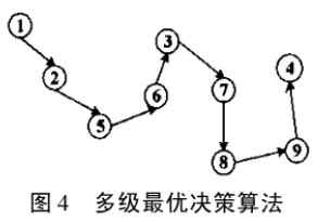 圖4 多級(jí)最優(yōu)決策算法路徑最優(yōu)問(wèn)題就簡(jiǎn)化為求經(jīng)過(guò)所有結(jié)點(diǎn)的路徑最短。.這里提出多級(jí)最優(yōu)決策算法:從開始的結(jié)點(diǎn)起,將要經(jīng)過(guò)下一個(gè)的結(jié)點(diǎn)是所有未經(jīng)過(guò)結(jié)點(diǎn)中距離當(dāng)前結(jié)點(diǎn)最近的那個(gè)結(jié)點(diǎn).如圖4所示,假如規(guī)定結(jié)點(diǎn)1是開始結(jié)點(diǎn),那么它的下一個(gè)候選結(jié)點(diǎn)有8個(gè),但結(jié)點(diǎn)2是距離最近的,所以結(jié)點(diǎn)1的下一結(jié)點(diǎn)是2:同理離結(jié)點(diǎn)2的下一個(gè)候選結(jié)點(diǎn)有7個(gè),最近的下一個(gè)結(jié)點(diǎn)是5.所以結(jié)點(diǎn)2的下一個(gè)結(jié)點(diǎn)是5……以此類推得出了以下的最優(yōu)路徑:從結(jié)點(diǎn)1開始,分別經(jīng)過(guò)2、5、6、3、7、8、9最后以結(jié)點(diǎn)4結(jié)束。