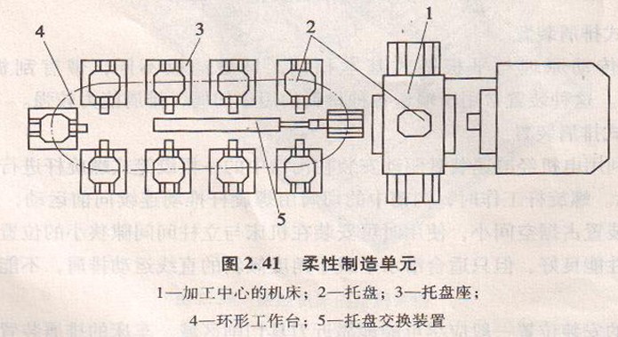 圖2. 42所示為由工業(yè)機(jī)器人和數(shù)控沖床組成的FMC,它在小型零件加工中應(yīng)用十分方便。工業(yè)機(jī)器人從工件臺(tái)架上將待加工零件搬運(yùn)到數(shù)控沖床上,并將已加工完的工件運(yùn)離數(shù)控沖床。