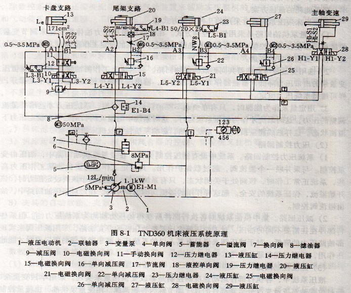 (1)數(shù)控沖床液壓系統(tǒng)圖8-1是數(shù)控沖床TND360沖床的液壓系統(tǒng)。該數(shù)控沖床液壓系統(tǒng)由液壓站和5條液壓支路組成。5條液壓支路是卡盤夾緊支路、尾架套筒移動支路、主軸變速支路和預留兩條支路所組成。