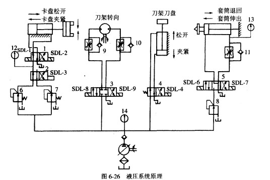 液壓傳動(dòng)系統(tǒng)在數(shù)控沖床的機(jī)械控制與系統(tǒng)調(diào)整中占有很重要的位置,它所擔(dān)任的控制、調(diào)整任務(wù)僅次于電氣系統(tǒng)。液壓傳動(dòng)系統(tǒng)被廣泛應(yīng)用到主鈾的自動(dòng)裝夾、主軸箱齒輪的變擋和主軸軸承的潤滑、自動(dòng)換刃裝置、靜壓導(dǎo)軌、回轉(zhuǎn)工作臺(tái)及尾座奇事結(jié)構(gòu)中。數(shù)控沖床的液壓系統(tǒng)原理見圖6-26所示,從中可看出它所驅(qū)動(dòng)控制的對(duì)象。如液壓卡盤、主軸上的松刀液壓缸、液壓拔叉變速液壓缸、液壓驅(qū)動(dòng)機(jī)械手、靜壓導(dǎo)軌、主鈾箱的液壓平衡液壓缸等。