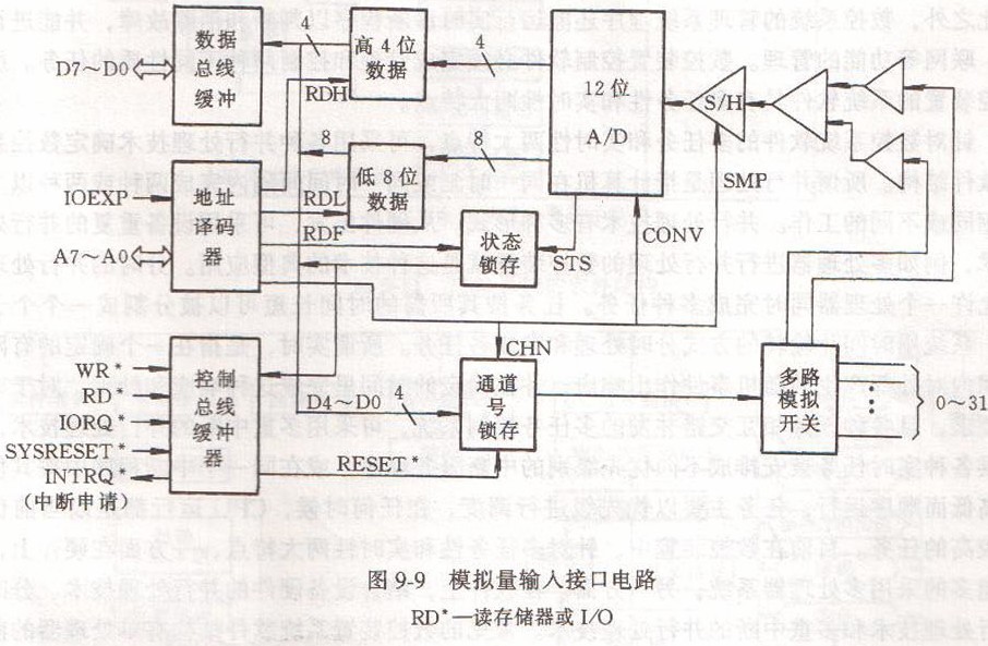 (2)模擬量輸人輸出接口數(shù)控?cái)?shù)控沖床中的被測量(如:位移、速度、溫度、力矩等)往往是連續(xù)變化的模擬信號,而執(zhí)行機(jī)構(gòu)(如電動機(jī))最需要以模擬量來驅(qū)動,因此模擬量輸入/輸出接口是數(shù)控系統(tǒng)中一種重要的接口方式。被測模擬量輸入接口電路即A/D轉(zhuǎn)換接口電路,被測模擬量(實(shí)際位置和速度等)經(jīng)過信號處理后,輸入模擬量輸入接口,由A/D轉(zhuǎn)換器轉(zhuǎn)換為數(shù)字量后,才能為數(shù)控裝置的計(jì)算機(jī)控制電路所接受;模擬量輸出接口電路即D/A轉(zhuǎn)換接口電路,數(shù)控系統(tǒng)送往執(zhí)行機(jī)構(gòu)的控制信號(位置命令和速度命令)應(yīng)經(jīng)過模擬量輸出接口的D/A轉(zhuǎn)換和信號調(diào)理后才能為執(zhí)行機(jī)構(gòu)所接受。如圖9-9所示是一般的模擬量輸入接口電路,主要由多路開關(guān)、采樣保持器、A/D轉(zhuǎn)換器、數(shù)據(jù)緩沖器及數(shù)控系統(tǒng)內(nèi)部總線接口邏輯電路所組成。電路采用分時多路工作方式,系統(tǒng)控制多路開關(guān)選擇某一路信號,其中的信號經(jīng)采樣保持后送至A/D轉(zhuǎn)換器,由A/D轉(zhuǎn)換器轉(zhuǎn)換成二進(jìn)制數(shù)據(jù)后暫存在數(shù)據(jù)緩沖器中,供其它電路模塊使用。總線接口邏輯電路根據(jù)不同的總線而異,和開關(guān)量輸入/輸出接口類似,它對總線信號進(jìn)行緩沖和驅(qū)動,并對地址信號進(jìn)行譯碼,實(shí)現(xiàn)通道的選擇和數(shù)據(jù)緩沖器中數(shù)據(jù)的輸入。在模擬電路和總線接口之間要采用光電隔離。圖9-10中所示是一種典型的12位轉(zhuǎn)換接口電路,一般的模擬量輸出接口主要有數(shù)控系統(tǒng)內(nèi)部總線接口邏輯、通道選擇器、轉(zhuǎn)換器和信號調(diào)理電路組成。數(shù)控系統(tǒng)內(nèi)部總線接口邏輯對要輸出的數(shù)據(jù)進(jìn)行緩沖后,同時送到各路D/A轉(zhuǎn)換器的輸入端,由通道選擇器產(chǎn)生的選通信號選擇一個轉(zhuǎn)換通道,該通道數(shù)據(jù)由D/A轉(zhuǎn)換器轉(zhuǎn)換為模擬量,送往信號調(diào)理電路,調(diào)理電路按照接受模擬量輸出的執(zhí)行機(jī)構(gòu)的要求,對模擬信號進(jìn)行各種變換后,輸出給相應(yīng)執(zhí)行機(jī)構(gòu)。