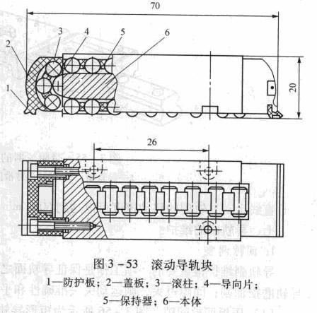 滾動導軌的滾動體可采用滾珠、滾柱、滾針。滾珠導軌的承載能力小,剛度低,適用于運動部件質量不大,切削力和顛覆力矩都較小的機床。滾柱導軌的承載能力和剛皮都比滾珠導軌大,適用于載荷較大的機床。滾針導軌的特點是滾針尺寸小,結構緊湊,適用于導軌尺寸受到限制的機床。近代數控機床普遍采用一種滾動導軌 支承塊,已做成獨立的標準部件,其特點是剛度高、承載能力大、便于拆裝,可直接裝在任意行程長度的運動部件上,結構形式如圖3 -53所示。1為防護板,蓋板2與導向片4引導滾動體返回, 5為保持稽。使用時用螺釘將滾動導軌塊堅固在導軌商上。當運動部件移動時,滾柱3在導軌面與本體6之間滾動不接觸,同時又繞本體6循環滾動,因而該導軌面不需洋硬磨光。
