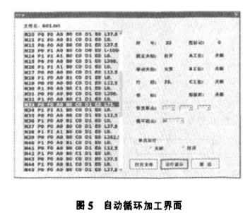進入零件加工界面后,可通過按鈕操作來選擇手動加工或自動加工。手動工作狀態下主要是進行單步的加工操作。在自動加工狀態下.首先打開包含零件加工代碼的TXT文件,然后選擇好循環起點,便可進行循環加工操作了,若選中單次運行下的打開按鈕,還可進行零件的單次加工。