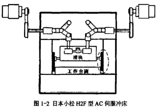 采用交流伺服電機驅動傳動機構,傳動機構將電機的旋轉運動轉化為滑塊的直線運動,通過位移傳感器檢測滑塊的運動實現閉環控制,滑塊和工作臺的距離還可以通過調模電機實現裝模高度的調整。加工時模具“上模一安裝在滑塊上,“下模一固定在工作臺面。由滑塊沖擊模具,從而沖擊出所需要的形狀和尺寸。一款交流伺服沖床的原理圖如圖2所示。