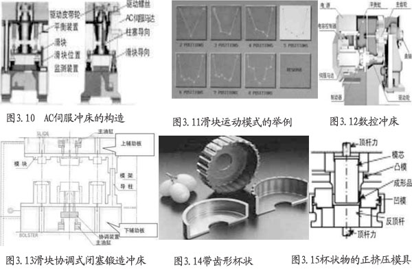 伺服工作機(圖3.10)是使用AC伺服馬達通過螺桿驅動滑塊的,成形中下死點的位置可通過位置讀取裝置提供數據給位置控置裝置進行控制。因此,機械的熱膨漲和彈性變形不會影響產品的精度,如圖3.11所示可以調整出最適合的滑塊運動方式及以極其微小的單位控制下死點的位置。所以適用于高精度高機能的無切削成形螺桿式伺服沖床采用油壓馬達和儲能器進行扭矩控制的形式,下死點的位置控制可達到微米級,是節省能源且有環保要求的機種。