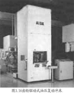 螺旋齒輪成形用復動油壓沖床如圖3.16所示。這種沖床共有滑動驅動用、滑塊內2個、工作臺內2個,共5個驅動源全部合用1個油壓式驅動裝置。