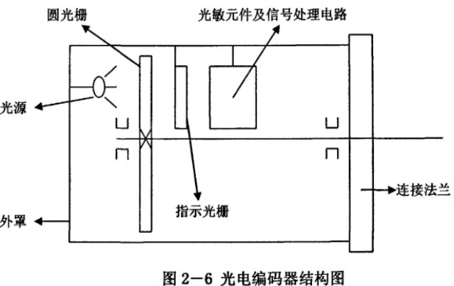 光電式編碼器由電路板、圓光柵、指示光柵、軸、光敏元件、光源和連接法蘭等組成。其中,圓光柵是在一個圓盤上刻有相等間隔角的線紋,分為透明和不透明的部分。指示光柵是與圓光柵位置相對平行的一扇形薄片,上面刻有相差1/4節距的兩個狹縫和一個零位狹縫,指示光柵的作用是判別光電編碼器的正反轉及軸的零位檢測,正反轉是通過相差1/4節距的兩個狹縫的脈沖先后順序來判斷的,零位檢測是通過零位狹縫的脈沖變化來判斷的。光敏元件及信號處理電路接收透過圓光柵和指示光柵的光信號,將其處理為角位移信號并輸出,圓光柵和工作軸一起轉動,其他部分包括光源、指示光柵、光敏元件及信號處理電路均與外罩固定。