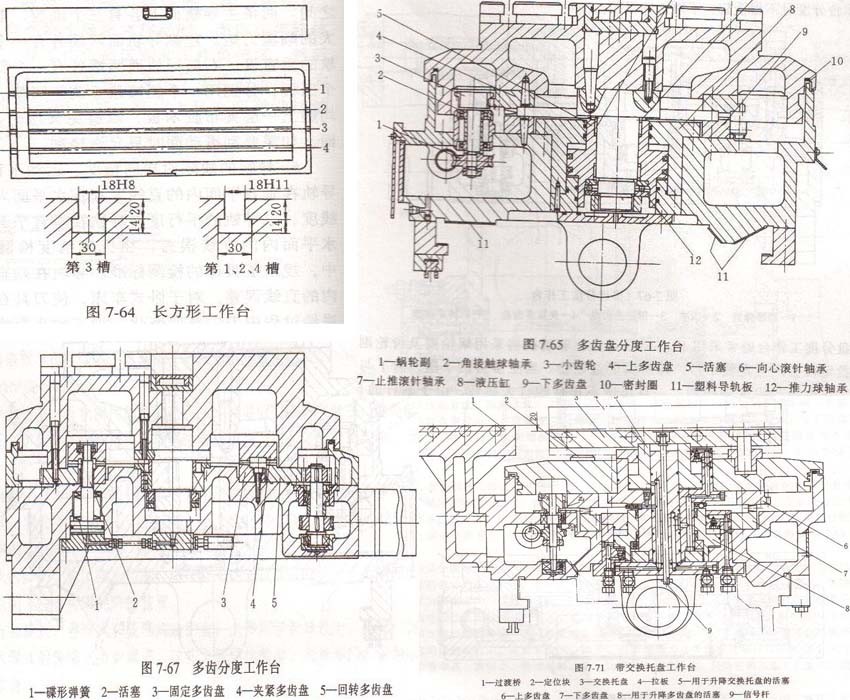 3、帶交換托盤的多齒分度工作臺為了提高加工中心的運轉率,在加工中心前面(或側面),設置二面或多面交換托盤,通過托盤自動交換裝置,與主機進行托盤交換。圖7-71所示為帶交換托盤的多齒分度工作臺結構。