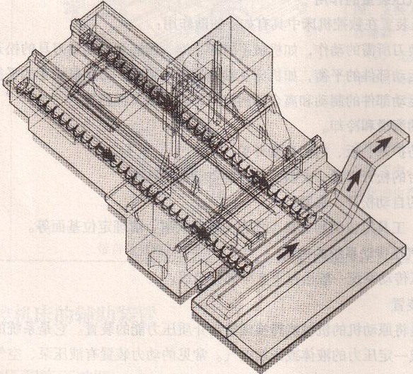 該裝置是利用電機經減速裝置驅動安裝在溝槽中的一根絞籠式螺旋桿進行工作的,如圖2 40(c)所示。螺旋桿工作時,溝槽中的切屑由螺旋桿推動連續向前運動,最終排人切屑收集箱。這種裝置占據空間小,使用時可安裝在機床與立柱間間隙狹小的位置上。螺旋槽排屑結構簡單、性能良好,但只適合滑水平或小角度傾斜的直線運動排屑,不能大角度傾斜提升和轉向排屑。