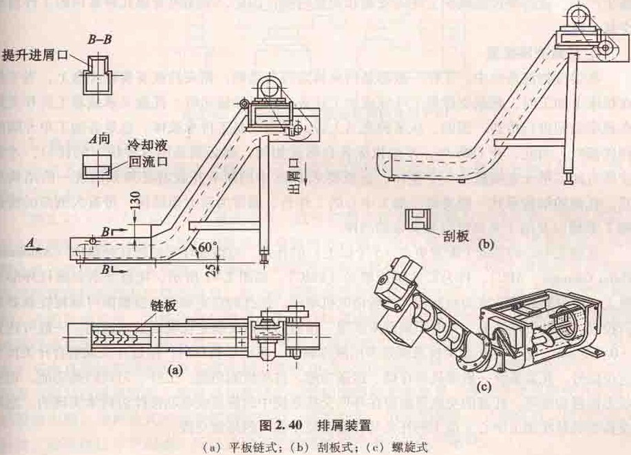 該裝置的傳動原理與平板鏈式基本相同,只是鏈板不同,帶有刮板鏈板,如圖2.40(b)所示、這種裝置常用于輸送各種材料的短小切屑,排屑能力較強,