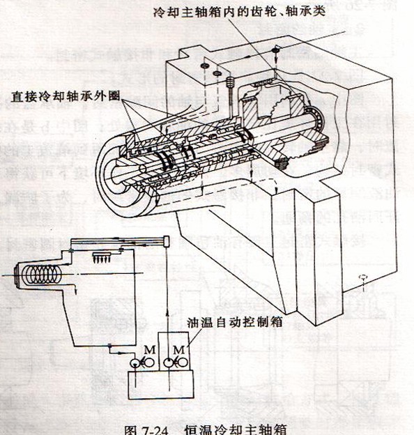 如圖7-24所示,是恒溫油液循環(huán)潤(rùn)滑冷卻方式。由油溫自動(dòng)控制箱控制的恒溫油液,經(jīng)油泵打到潤(rùn)軸箱,一路沿主軸前支承套外暖上的螺旋槽流動(dòng),帶走主軸軸承所發(fā)出的熱量。另一路通過(guò)主輔精內(nèi)的分油器,把恒溫油噴射到傳兩齒輪和傳動(dòng)軸支承軸承上,以帶走它們所產(chǎn)生的熱量。這種方式潤(rùn)滑和降溫效果都很好。